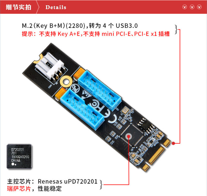 别让接口不足成为制约效率的瓶颈!西霸专为工控机、台式机设计的M.2 Key B+M转USB3.0四口扩展转接卡,凭借超强兼容性、稳定传输性能和便捷安装设计,成为解决多设备扩展需求的优选方案,轻松解锁设备接口“扩容自由”。