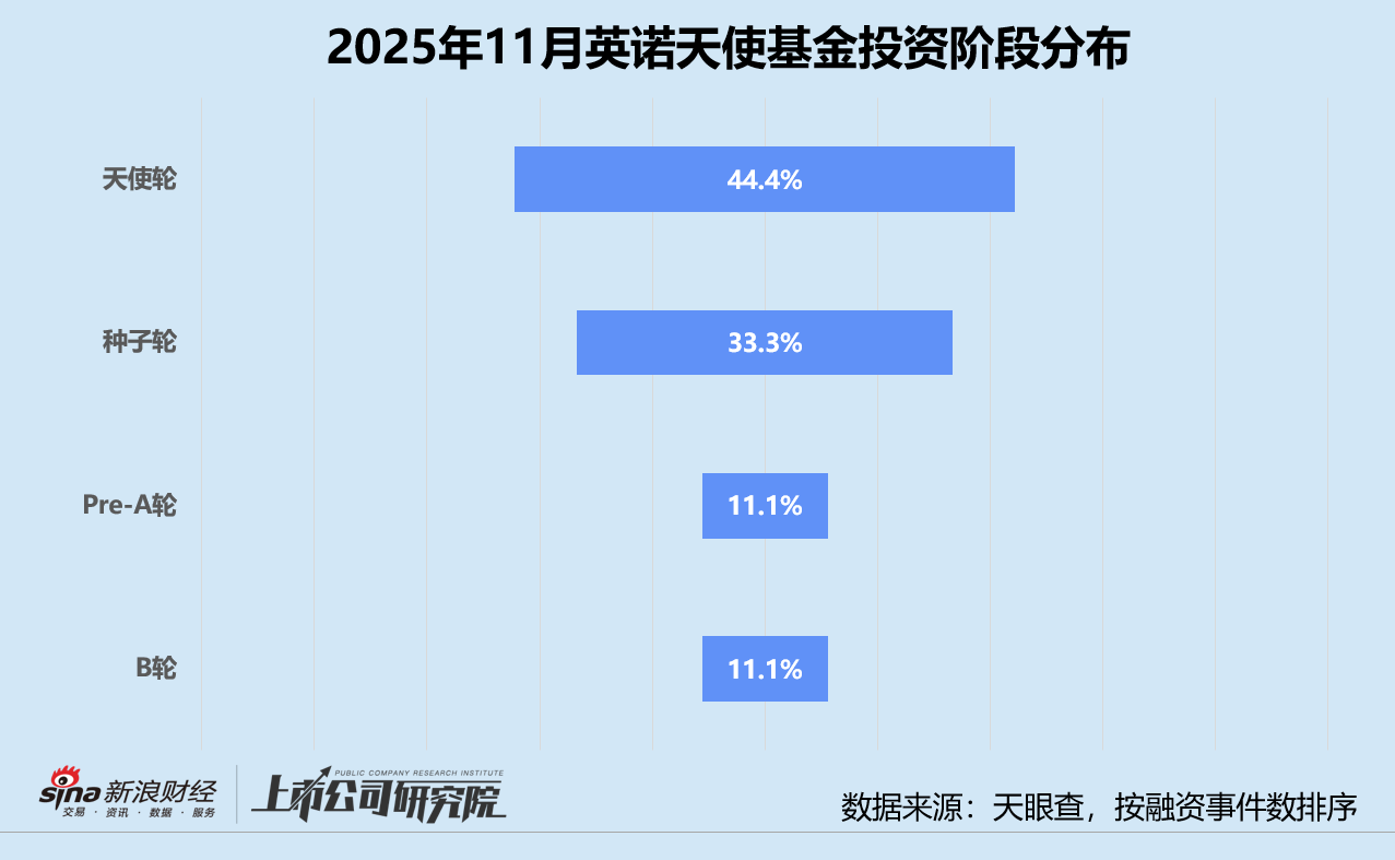 从投资阶段来看,本月英诺天使基金参与的投资事件中,近九成集中在天使轮(44.4%)、种子轮(33.3%)、Pre-A轮(11.1%)。唯一一笔投向人形机器人研发公司「加速进化」的B轮融资,为对早期入股项目的后续跟进。公开信息显示,英诺天使基金2023年便参与了该公司的天使轮,Pre-A轮和A轮均有加码。