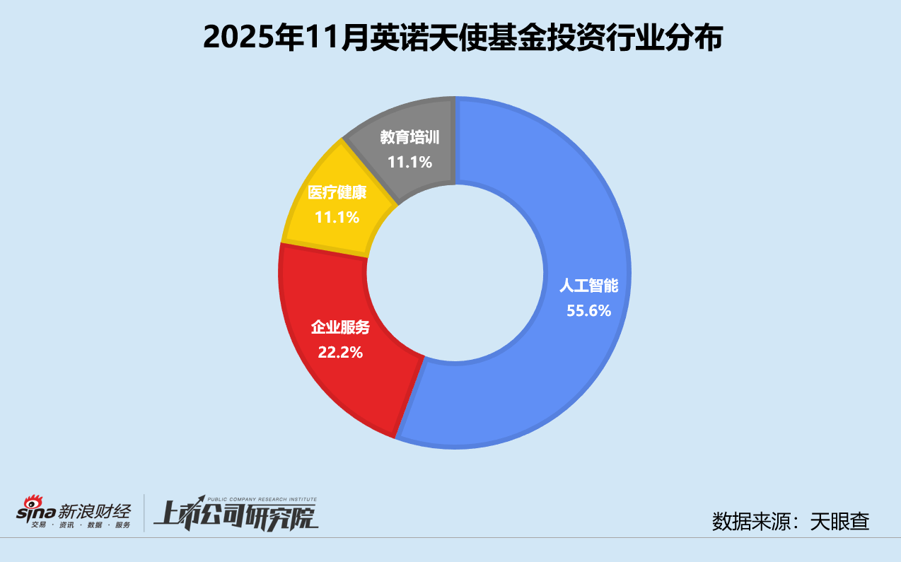 从行业分布来看,英诺天使基金本月的被投企业重点集中在人工智能行业,占比达55.6%,企业服务紧随其后,获投数量约占22.2%。“单赛道主导+多领域补充”的布局模式,与当前一级市场的早期投资热点吻合,AI优质项目供给充足,企业服务、医疗健康和教育培训既是商业模式成熟的赛道,也与AI技术场景落地验证关联性较强。